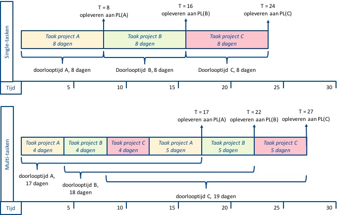 De medewerker gaat daarom multi-tasken: Even aan taak A werken, dan aan B, vervolgens aan C om A weer op te pakken als hij tijd heeft. Dit betekent dat de individuele tijd per taak toeneemt omdat multi-tasken nu eenmaal betekent dat de medewerker elke keer zijn taken opnieuw moet opstarten. Tevens zal de doorlooptijd (= de tijd van taakstart tot taakoplevering) van elke taak door deze versnippering sterk toenemen: 8 dagen worden al gauw 17 tot 19 dagen. Het gevolg is dat elke projectleider de projecttaak later opgeleverd krijgt dan oorspronkelijk in de “single-tasken” situatie het geval was. De volgende afbeelding maakt een en ander duidelijk.