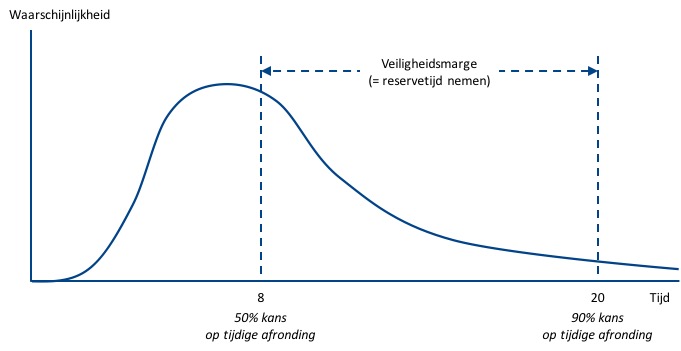 De medewerker gaat dus multi-tasken en heeft ervaren dat de doorlooptijd van zijn projecttaken behoorlijk toeneemt. Dit is van invloed op de tijdsinschattingen die hij voor toekomstige taken zal afgeven aan projectleiders. Voorheen gaf hij gemiddeld 8 dagen als schatting af voor één taak. Door zijn ervaringen zal hij deze inschatting (in bovenstaand voorbeeld) langzaamaan bijstellen naar ongeveer 17 dagen. Het management team van het bedrijf probeert meestal 10% lucht uit projectplanningen te drukken. Dat weet de medewerker dus daarvoor neemt hij ook 2 dagen reservetijd in acht. En de projectleider verwacht van de medewerker dat de schatting 90% zeker is, dus ook hier wordt nog 1 dag reservetijd genomen. Uiteindelijk rondt de medewerker de benodigde tijd daarom af naar 20 dagen; 8 werkdagen en een heleboel reservetijd (150% is geen uitzondering). De volgende afbeelding maakt een en ander duidelijk.