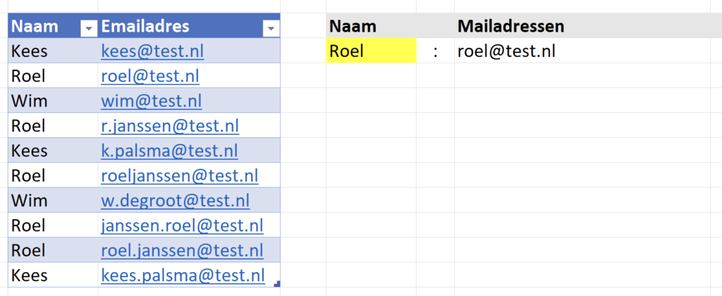 In onderstaand voorbeeld zie je een kleine tabel met namen en emailadressen. Ik wil dat Excel mij alle (5) emailadressen van Roel toont. Zou ik hiervoor een van de hierboven genoemde functies gebruiken, dan krijg ik alleen roel@test.nl als antwoord. Deze functies stoppen namelijk met werken, zodra de gezochte naam voor het eerst is gevonden.